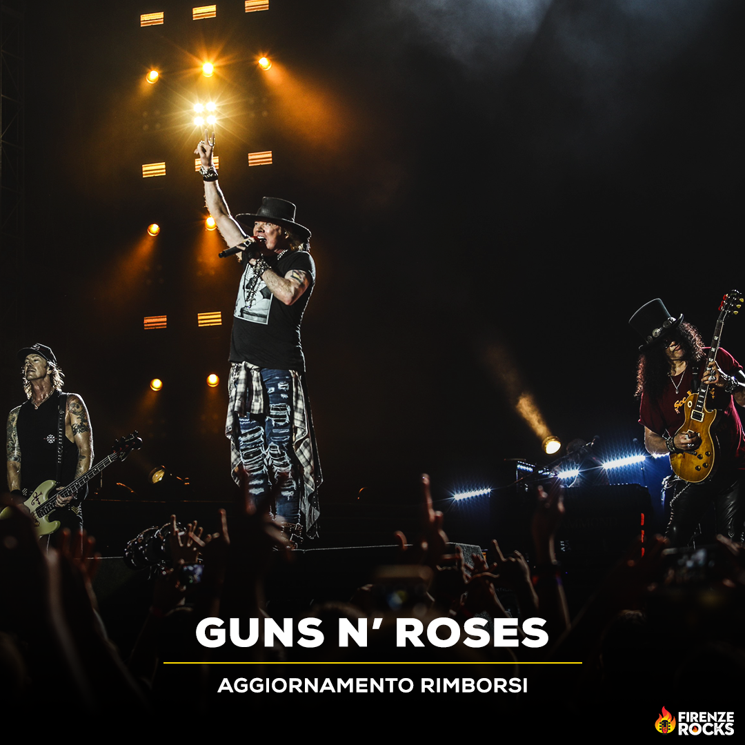 In ottemperanza al decreto-legge 19 maggio 2020 n. 34, convertito con modificazioni dalla legge 17 luglio 2020 n. 77 e chiariti i termini della sua applicazione, siamo a confermare la possibilità di richiedere il rimborso monetario per lo show cancellato dei GUNS N’ROSES previsto il 12 giugno 2020 al Festival Firenze Rocks.
