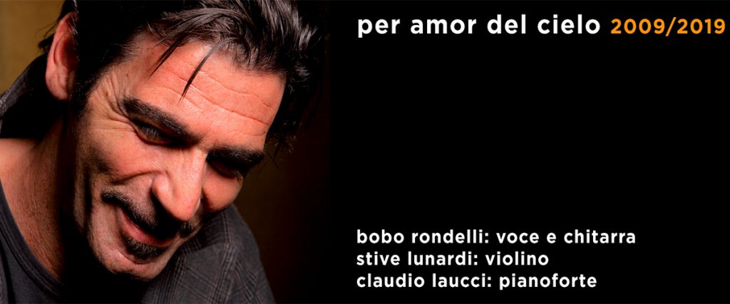 Dopo dieci anni dalla sua uscita Bobo Rondelli porta nuovamente sul palco Per Amor del Cielo, l’album che ha decretato la sua consacrazione tra i grandi della musica d’autore italiana. L’intero album sarà nuovamente arrangiato in una veste ancor più nuda e intima: solo Bobo, una chitarra un pianoforte e un violino.