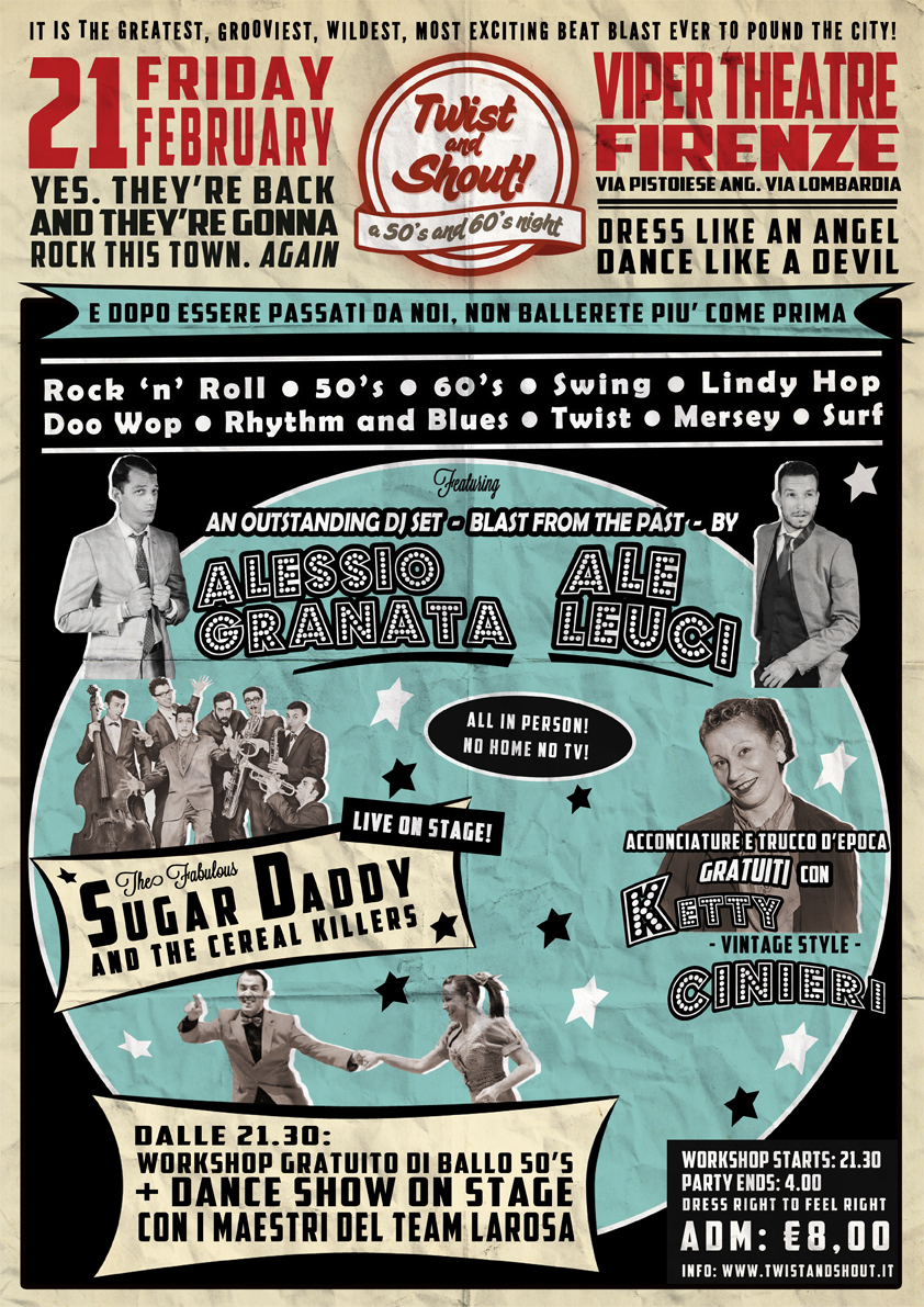 In consolle, pronti a deliziarvi per tutta la sera con i loro brani, ALESSIO GRANATA ed ALE LEUCI: rock ‘n’ roll, fifties, sixties, swing, lindy hop, rhythm and blues, garage, beat, doo wop, American, English and Italian Graffiti, boogie- woogie, twist, shout, loud, colonne sonore del ventennio più fervente di tutti i tempi che ormai da due stagioni fanno agitare bacini e fianchi della popolazione italiana, gente che ha voglia di ballare ritmi autentici sino all’esaurimento.