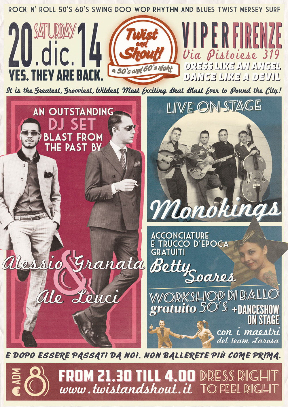 ★ In consolle, pronti a deliziarvi per tutta la sera con i loro brani, il combo Monsieur ALESSIO GRANATA e Monsieur ALE LEUCI: rock ‘n’ roll, fifties, sixties, swing, rhythm and blues, garage, beat, doo wop, American, English and Italian Graffiti, boogie- woogie, twist, shout, loud, colonne sonore del ventennio più fervente di tutti i tempi che ormai da due stagioni fanno agitare bacini e fianchi della popolazione italiana, gente che ha voglia di ballare ritmi autentici sino all’esaurimento.
